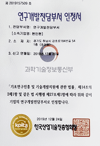 Certificate of Recognition for Dedicated R&D Department